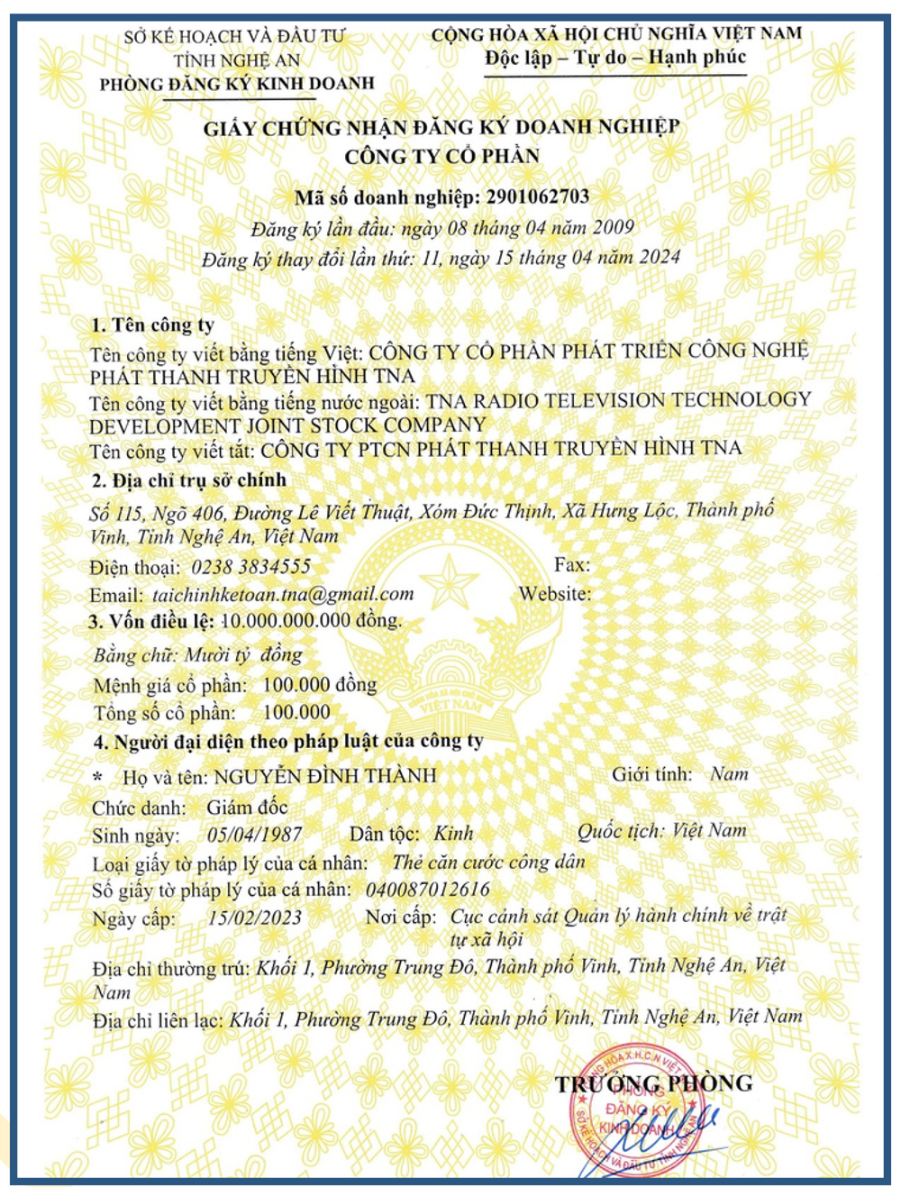 Tên công ty: CÔNG TY CỔ PHẦN PHÁT TRIỂN CÔNG NGHỆ PHÁT THANH TRUYỀN HÌNH TNA